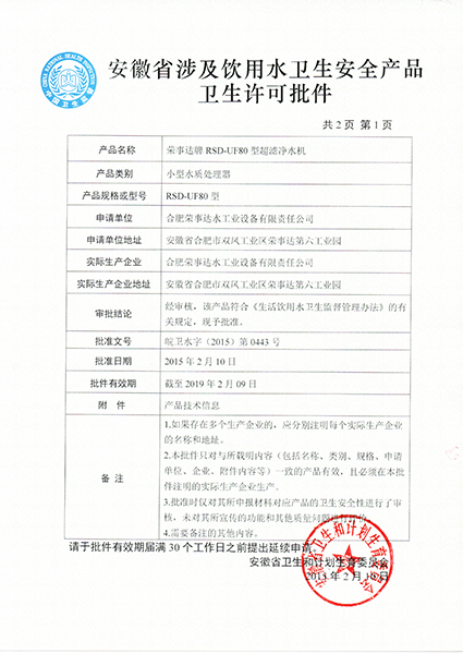 RSD-UF80型超濾凈水機(jī)衛(wèi)生許... -